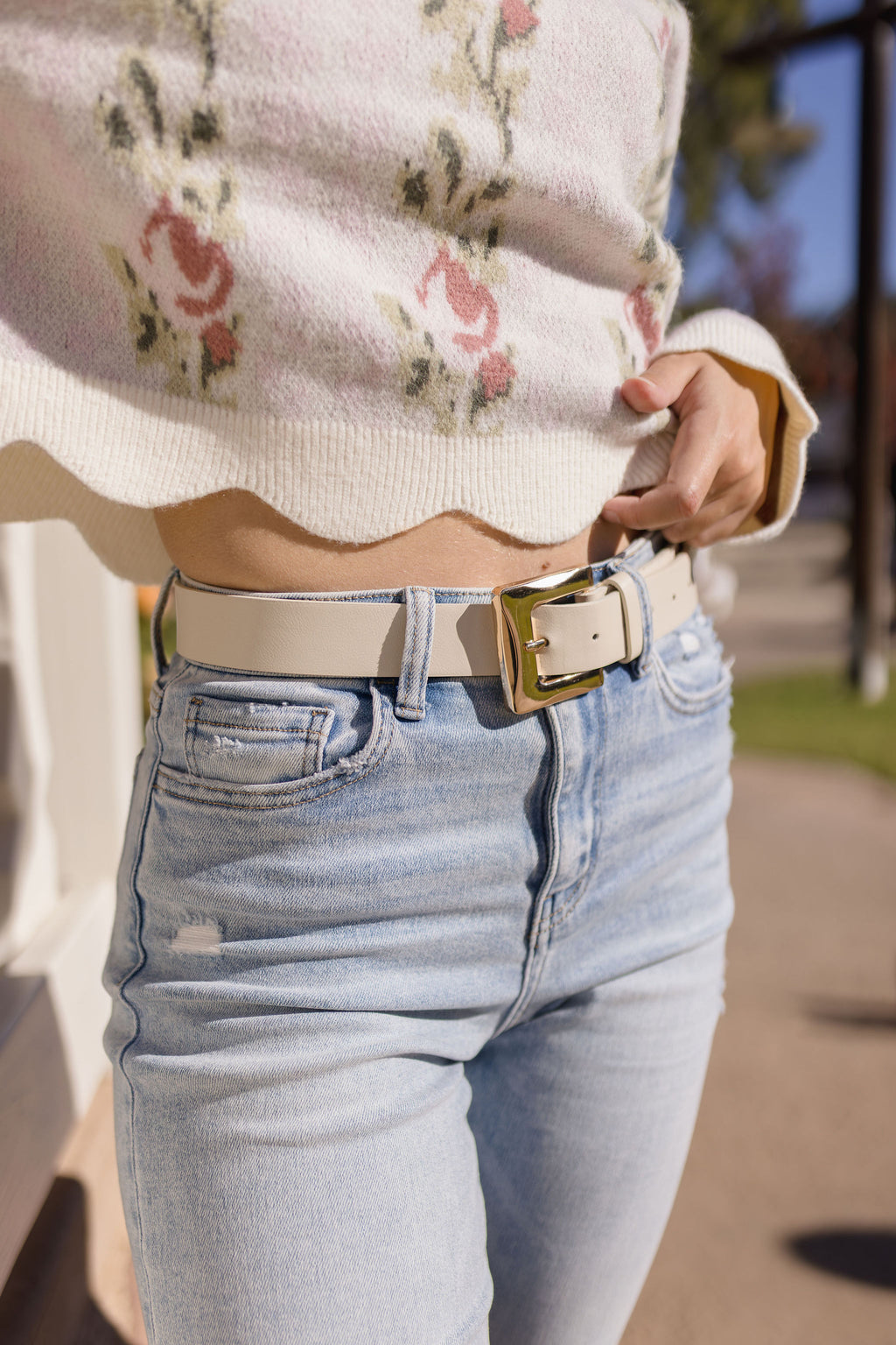 Greer Contrast Stitched Rectangle Buckle Belt Beige