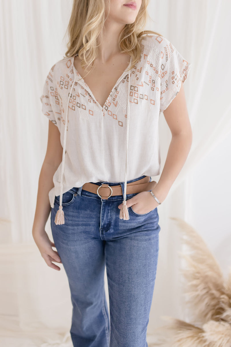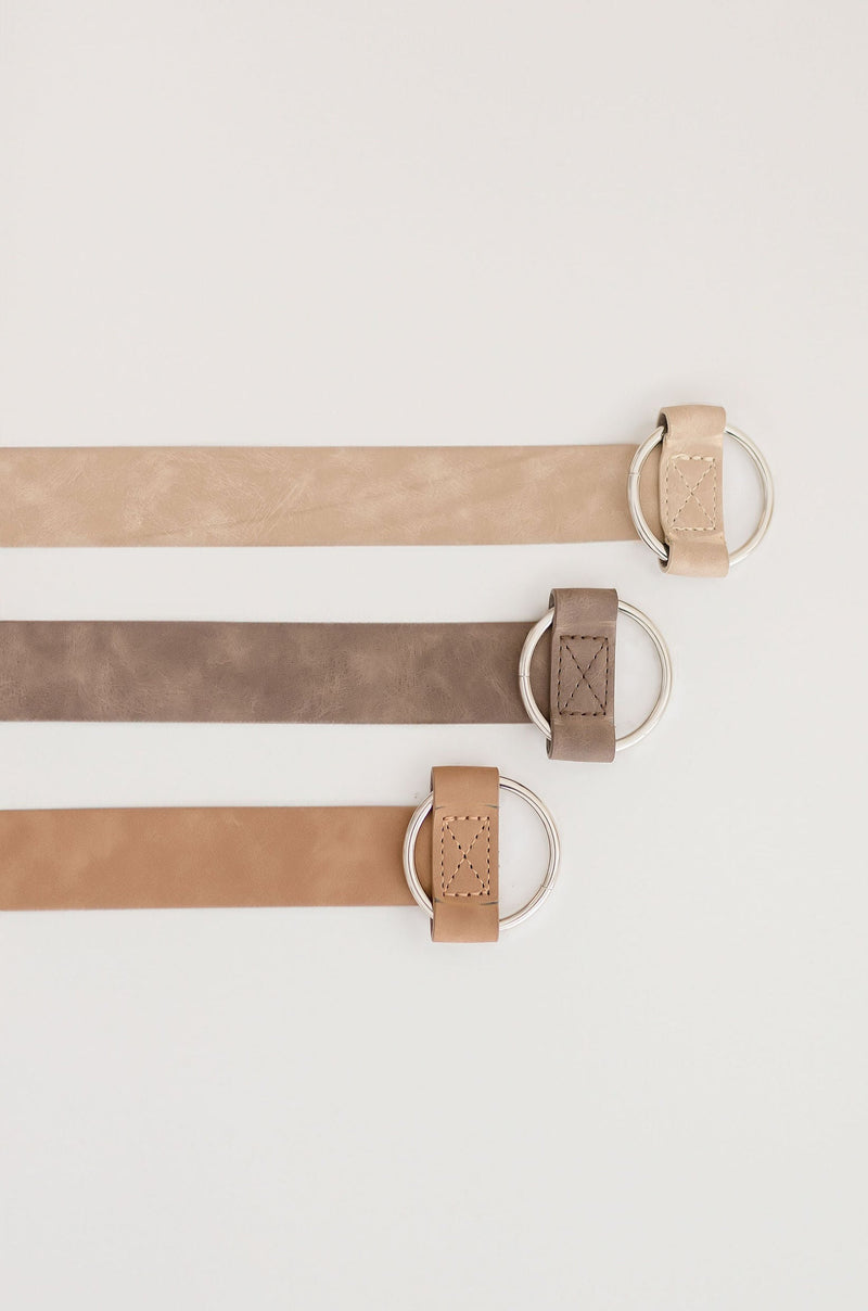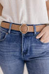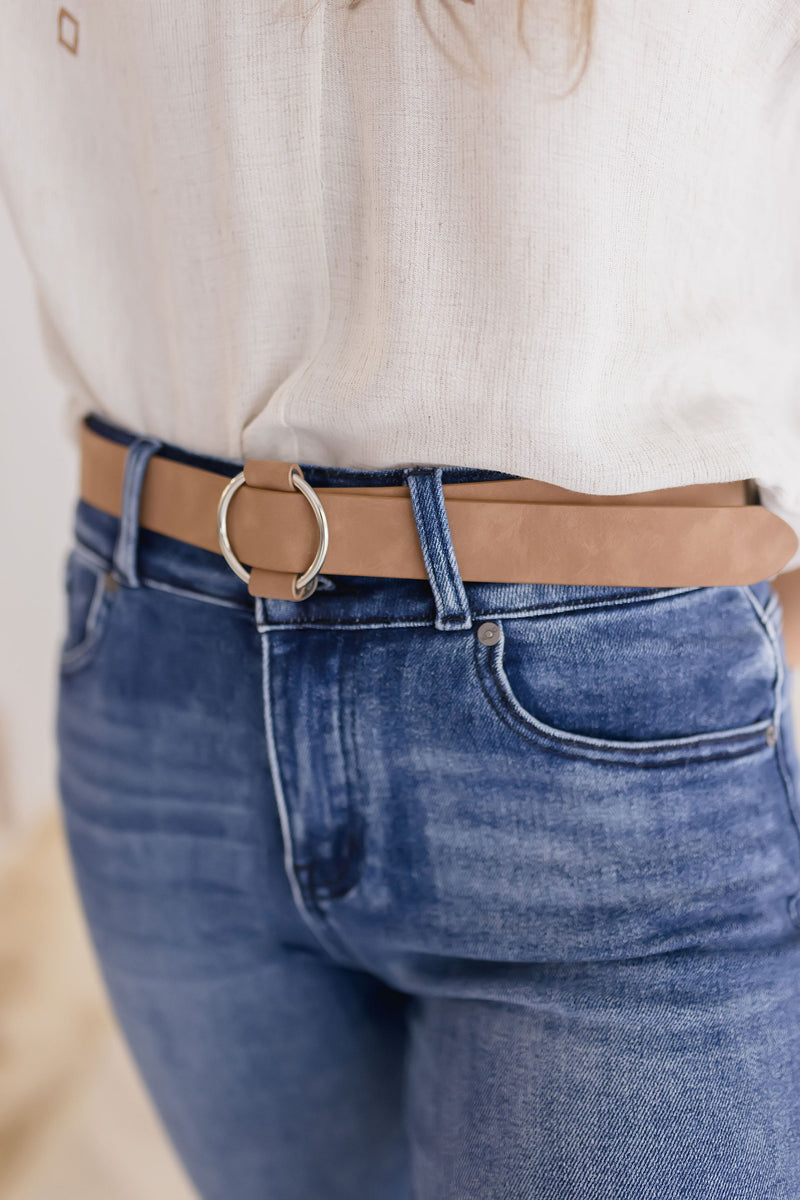 Make the Quinn Adjustable Circle Buckle Belt the go-to finishing touch for all your outfits. Made of a soft taupe faux leather with a shiny silver circle shaped buckle and no belt holes.