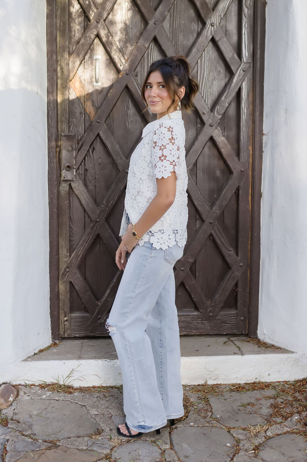 Vera Short Sleeve Button Down Floral Scalloped Lace Top White