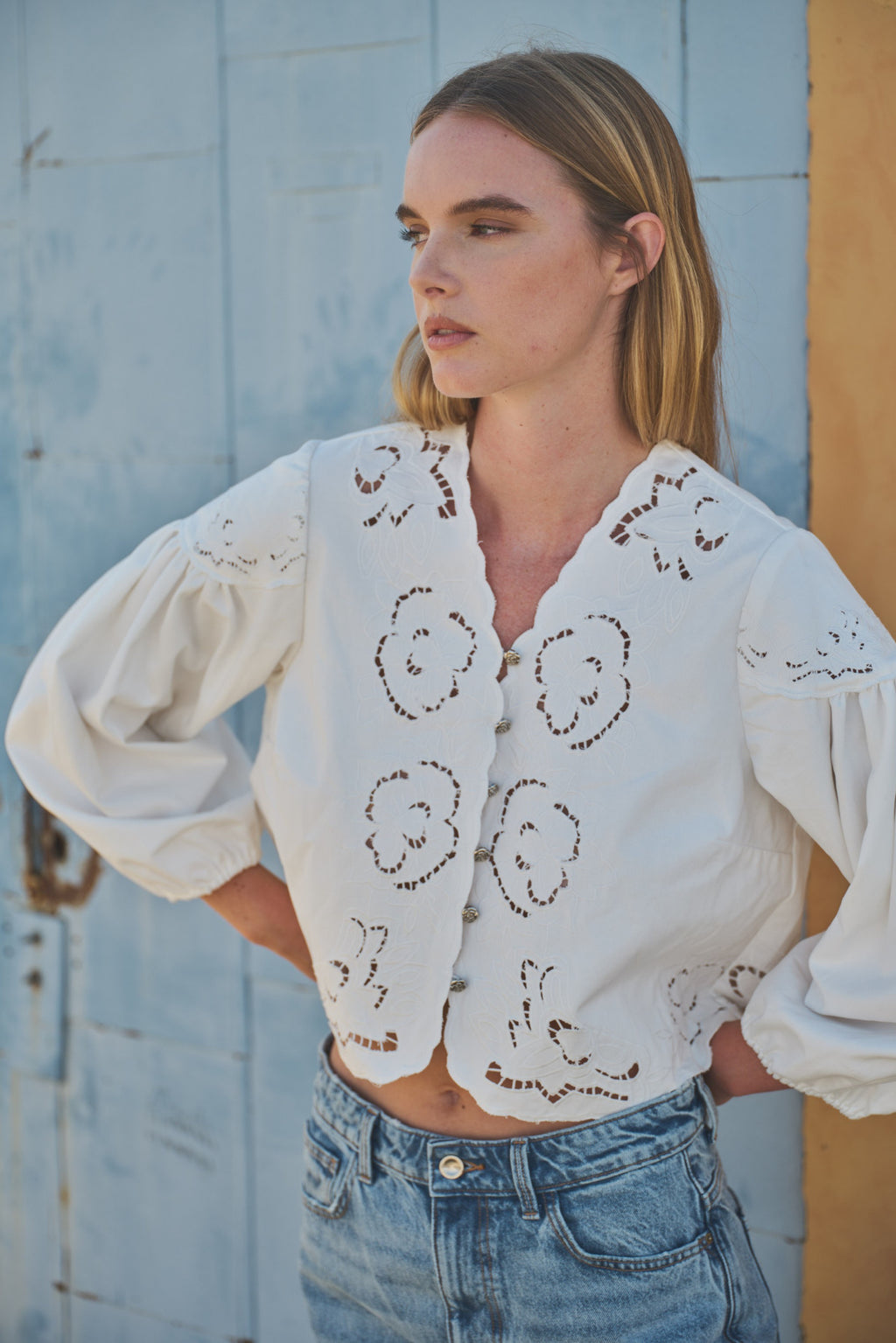 Sydney 3/4 Puff Sleeve Button Down Floral Embroidered Top White