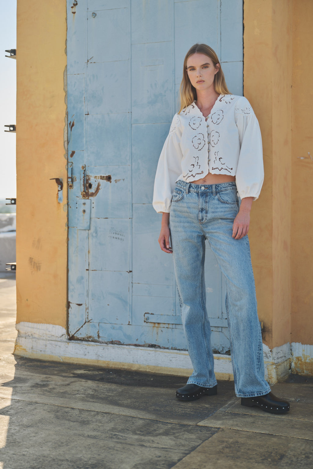 Isla Long Sleeve Button Down Embroidered Lace Trim Top White