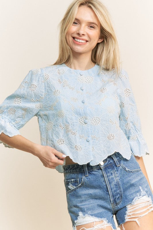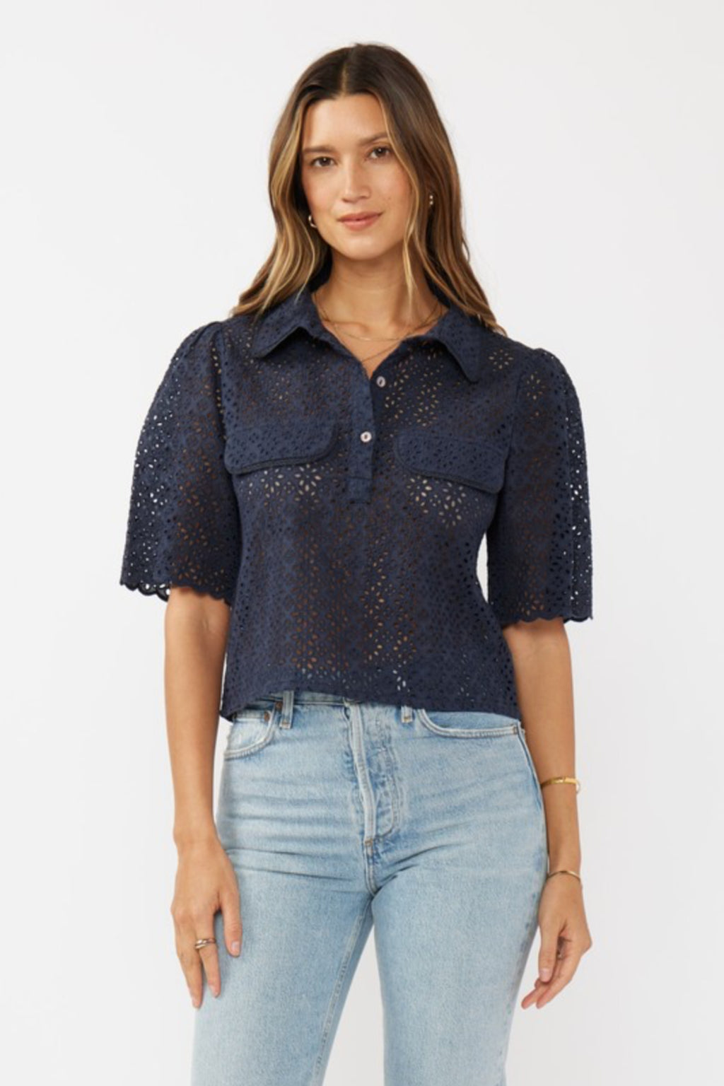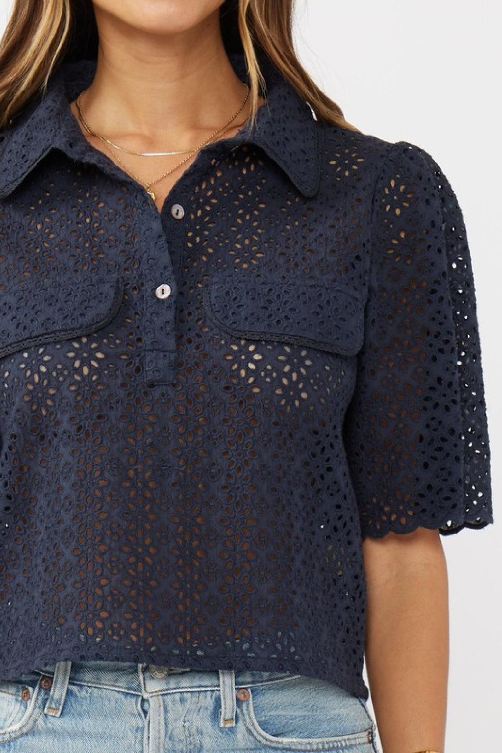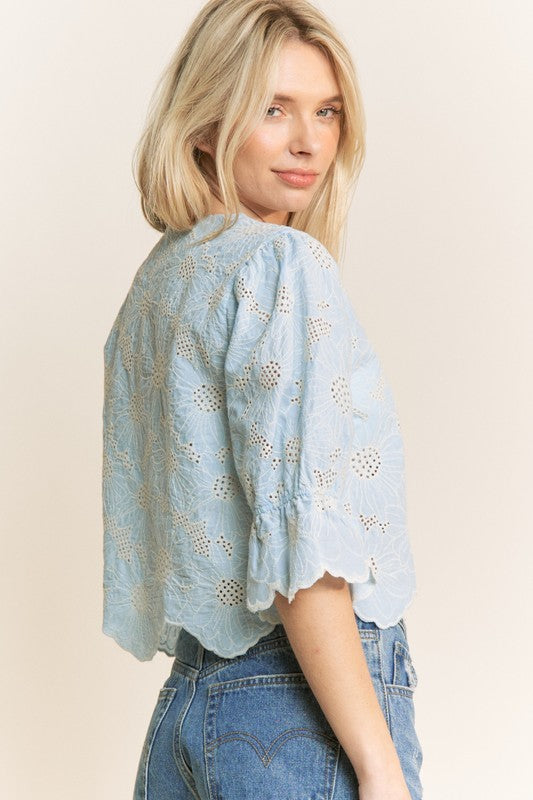 Bristol Puff Sleeve Floral Embroidered Top And Mini Skirt Set Navy