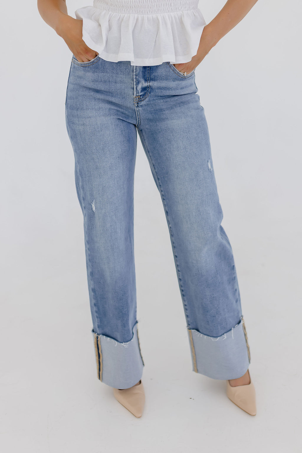 Leah High Rise Wide Leg Cuffed Jeans Medium Wash