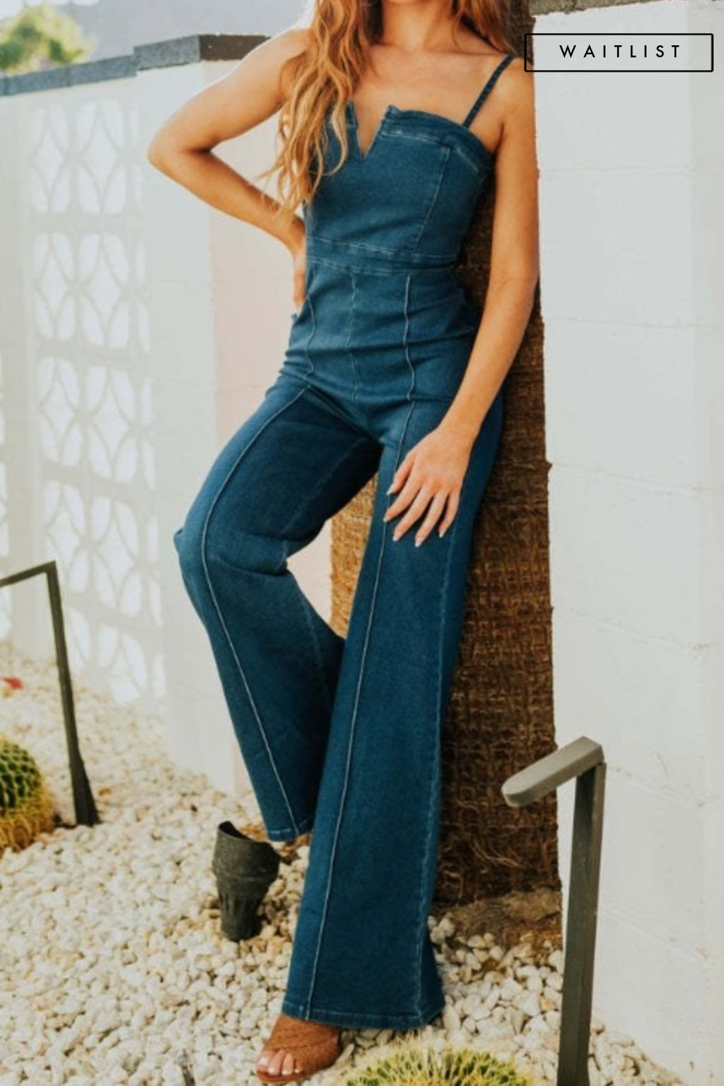 Juniper Short Puff Sleeve Waist Tie Wide Leg Denim Jumpsuit Dark Wash
