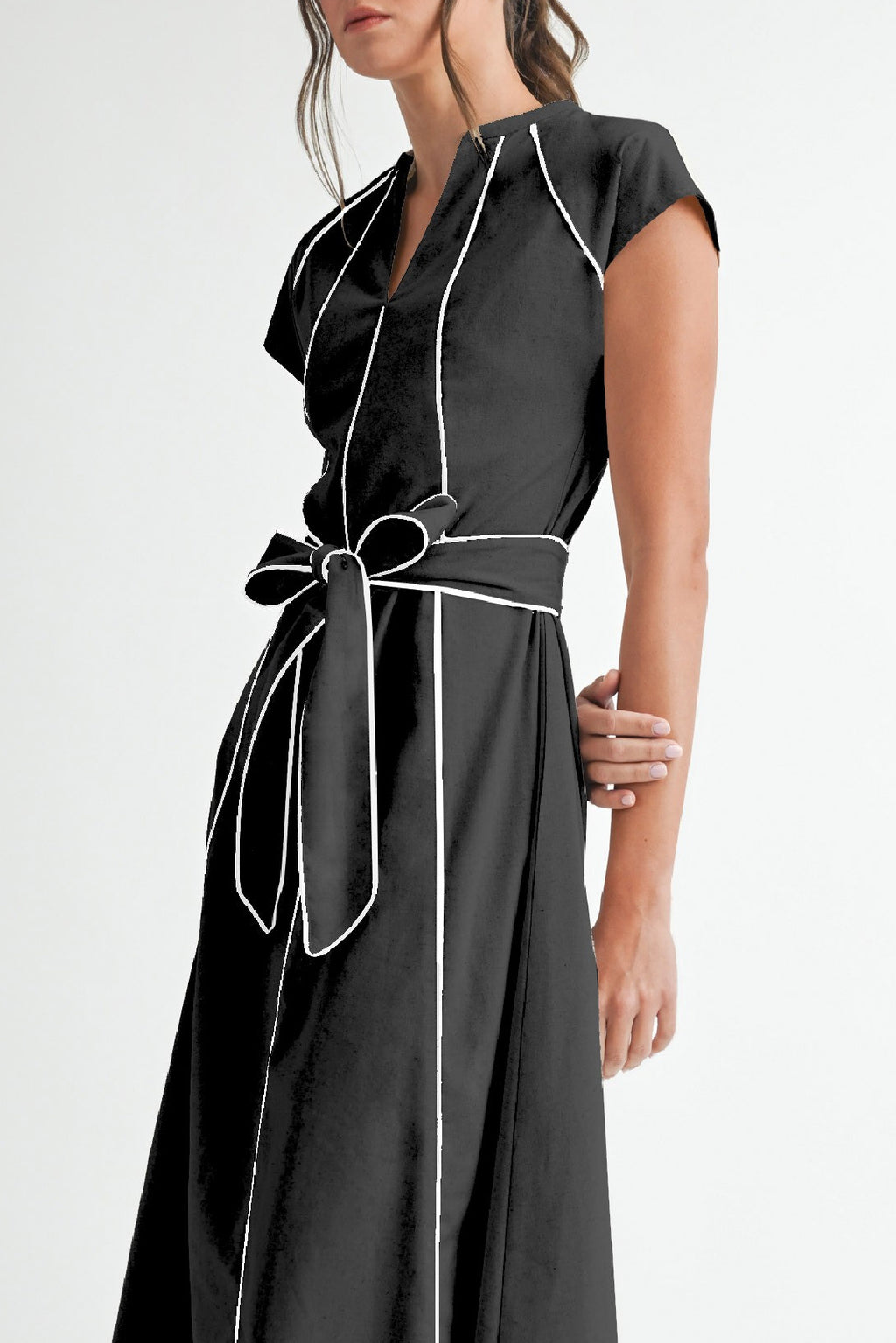 Nova Short Sleeve Stripe Contrast Waist Tie Linen Midi Dress Black