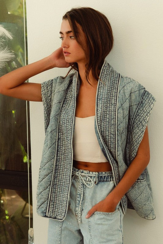 Kay Sleeveless Oversized Open Front Quilted Denim Vest Blue