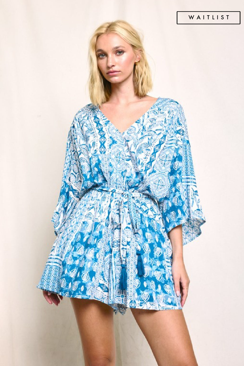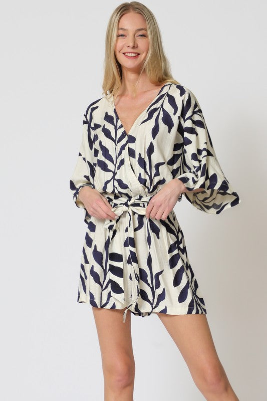 Waitlist 2/10 • Marlowe Short Sleeve Waist Tie Tropical Print Romper Green