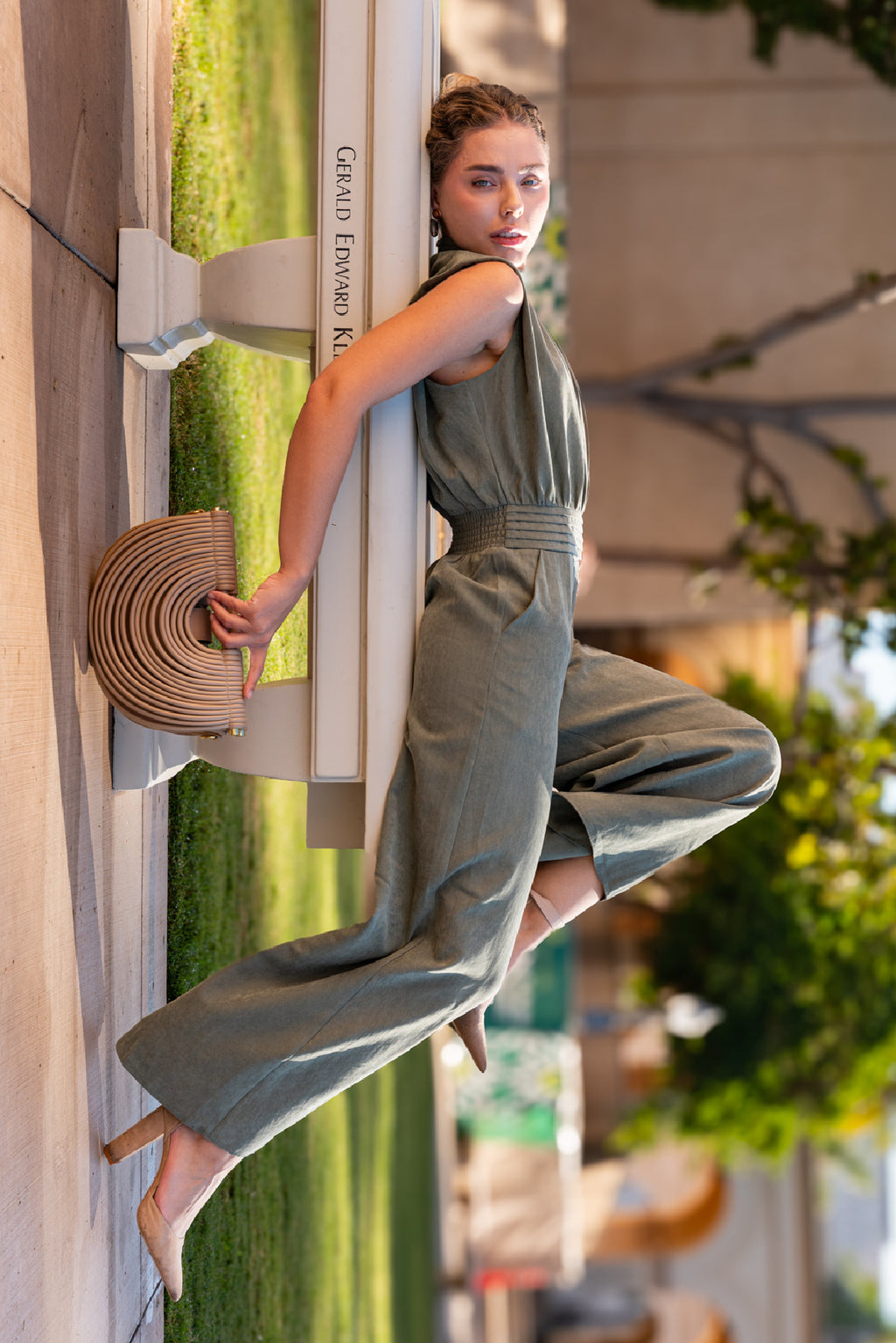 Claire Sleeveless Cinched Waist Wide Leg Suede Jumpsuit Olive