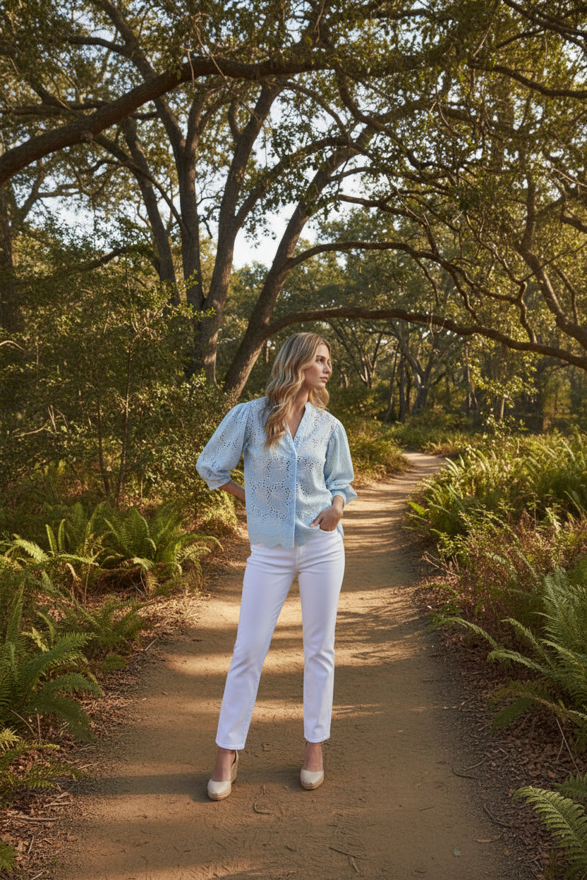 Aveline 3/4 Puff Sleeve Button Down Embroidered Floral Top Blue