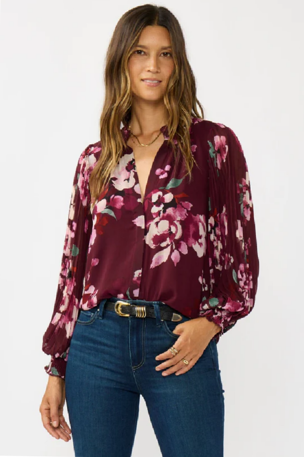 Ari Long Pleated Sleeve Button Down Top Burgundy