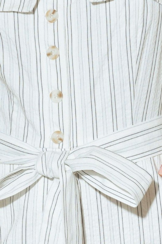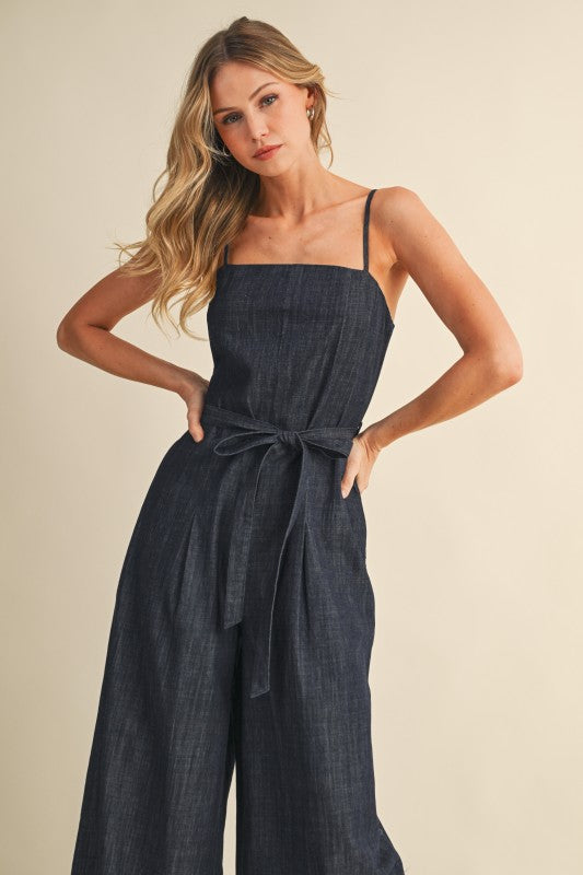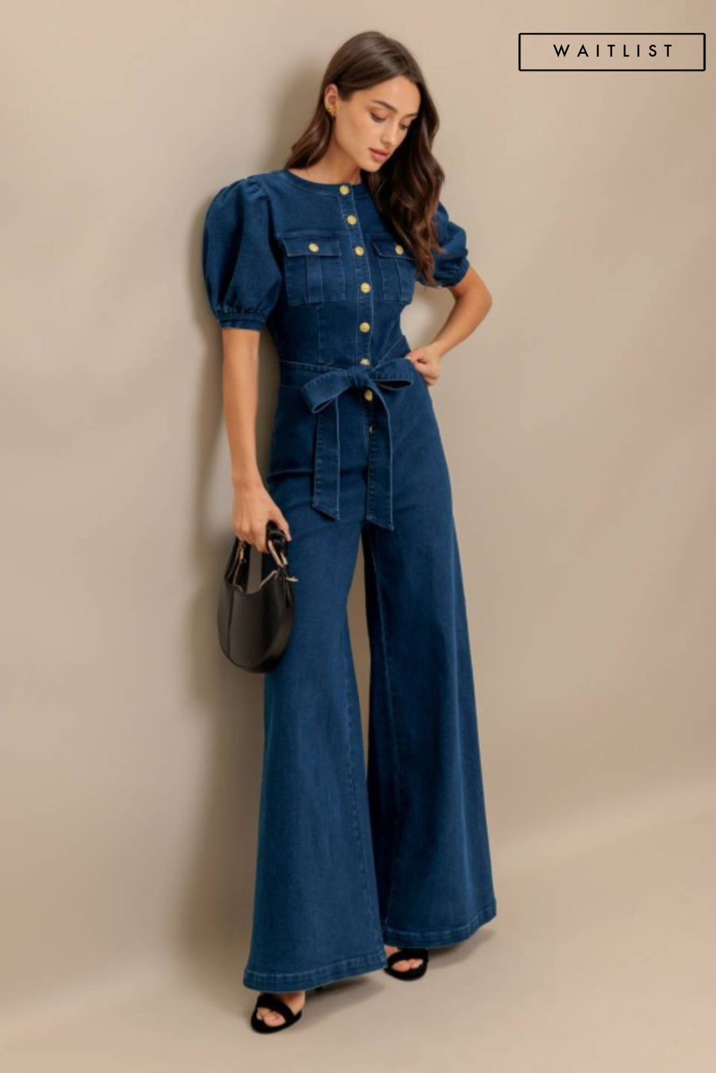 Juniper Short Puff Sleeve Waist Tie Wide Leg Denim Jumpsuit Dark Wash
