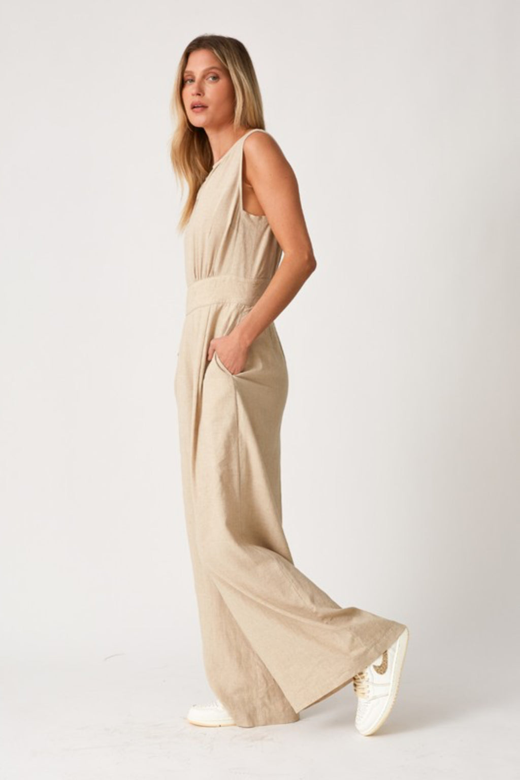Claire Sleeveless Cinched Waist Wide Leg Suede Jumpsuit Olive