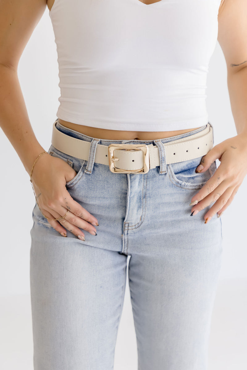 The Diana Belt is perfect for adding a touch of playfulness to any look. Made from vegan leather, this khaki belt features a unique angled rectangle buckle in shiny gold hardware.
