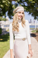 Simple yet super trendy, our Kendra Logo Buckle Belt is made of a smooth grey faux leather. Made in an adjustable fit with gold designer inspired buckle and slim width.