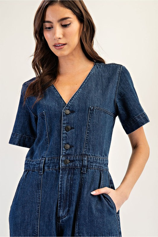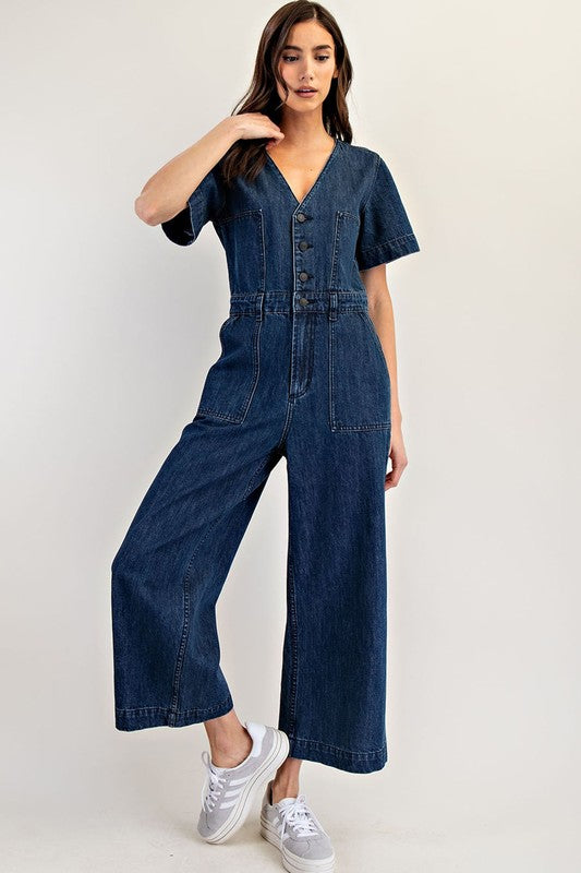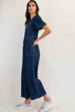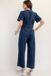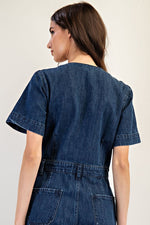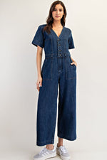 Short Puff Sleeve Waist Tie Wide Leg Denim Jumpsuit Dark Wash