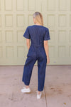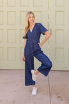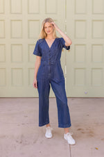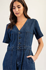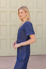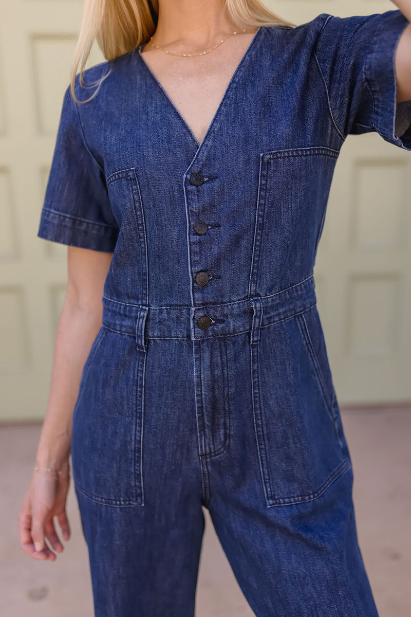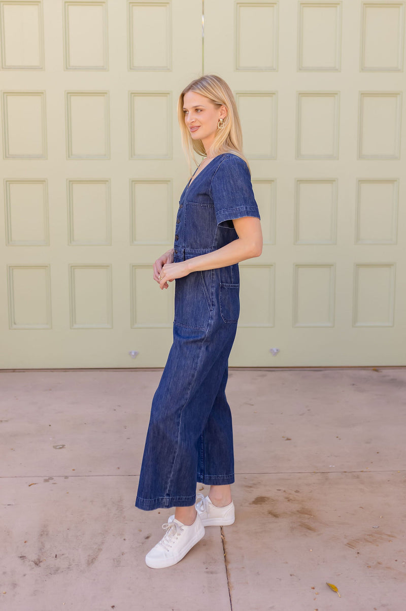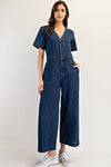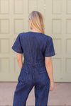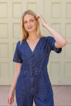 Juniper Short Puff Sleeve Waist Tie Wide Leg Denim Jumpsuit Dark Wash