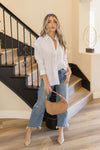 3/4 Puff Sleeve Button Down Floral Embroidered Top White